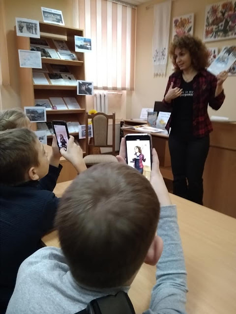 У бібліотеці 13 сьогодні відбулось чудове, веселе, з гумором літературне свято для дітей. До нас на зустріч з школярами 4А школи 174 завітала тендітна чарівна жінка, письменниця, авторка і виконавиця пісень, бібліотекарка з дитячої бібліотеки, мрійниця і мандрівниця Валентина Захабура. Наша творча колега організовує та проводить літературні студії для дітей і юнацтва. Пише оповідання та повісті для дітей різного віку, бо вірить, що в кожній дорослій людині також живе дитина.